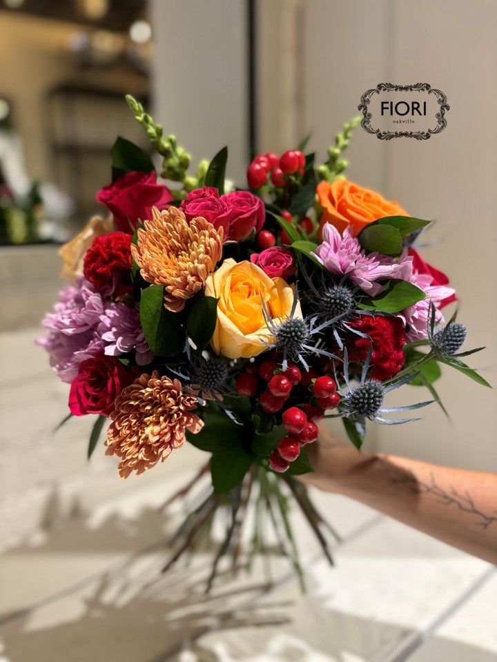 This vibrant and playful bouquet of fall flowers is a combination of rich burgundy and hot pink tones with a splash of orange and peach.