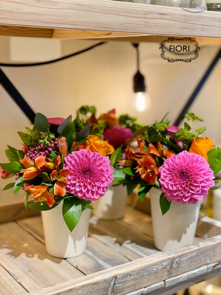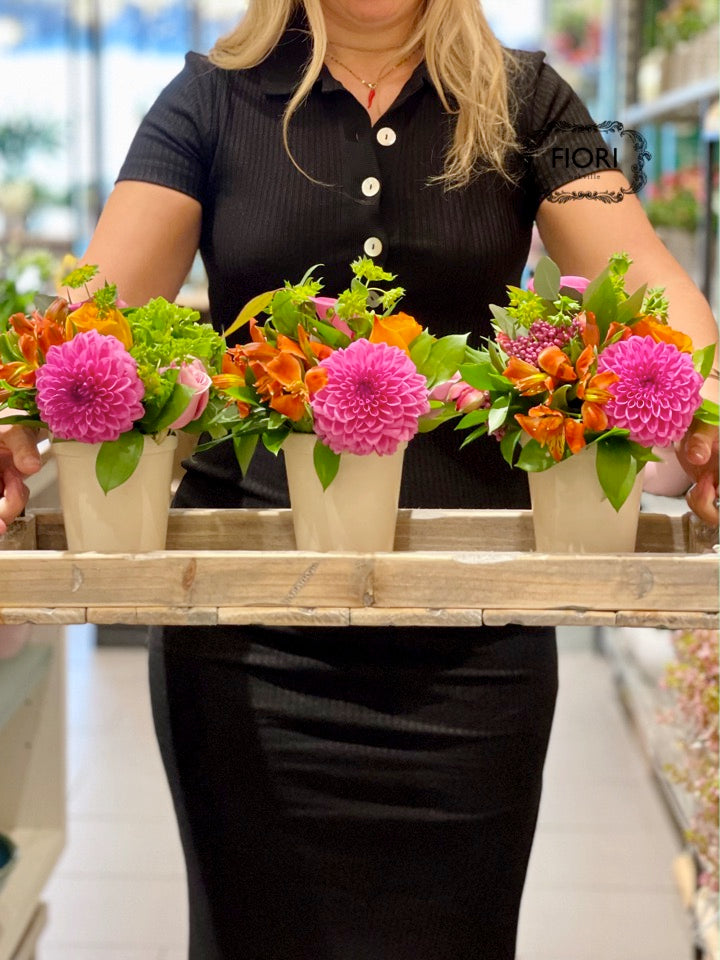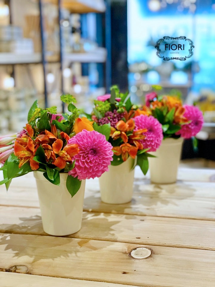 Fun and joyful this set of three colourful posies filled with vibrant local seasonal late summer early fall flowers presented in a our exclusive julep-shaped containers that are sure to become the life of the party or any gathering this summer.