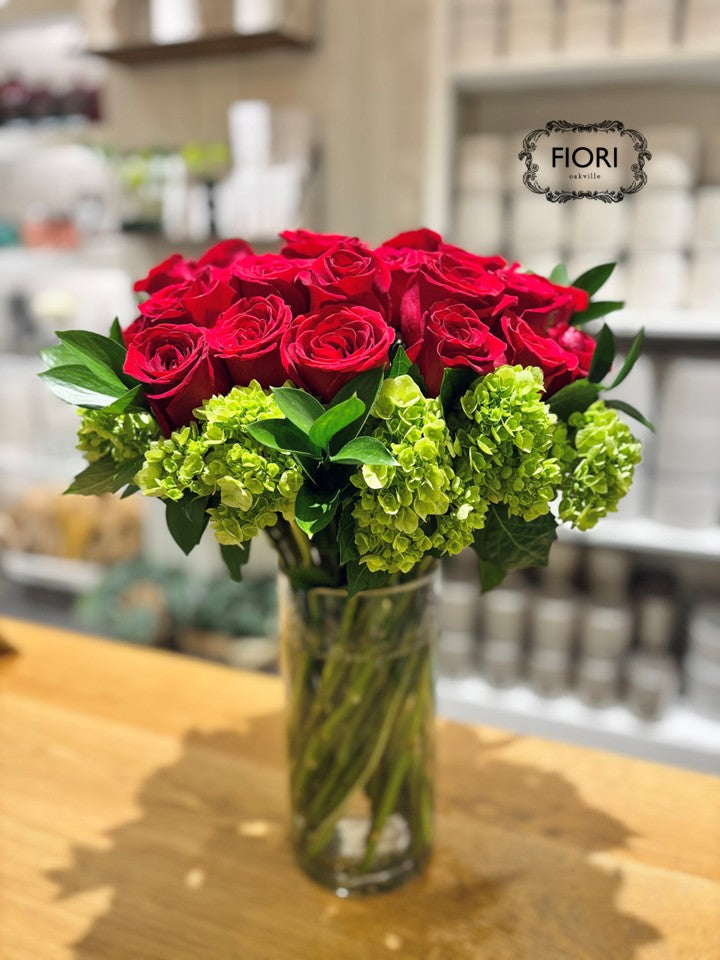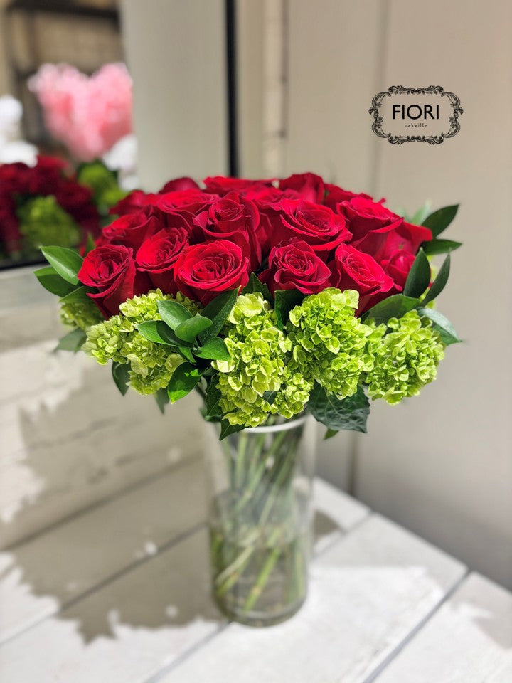 Luxury long stem red roses surrounded by a circle of beautiful green hydrangeas . This outstanding flower bouquet is elegant and sophisticated and yet modern and minimalist. It is delivered in a tall clear vase for a perfect clean finish.