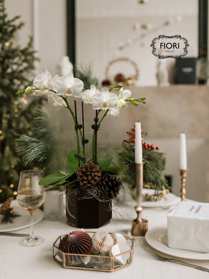 Designed to bring sophisticated, festive elegance into any space, this set features two pristine white miniature orchid plants, nestled delicately amongst a natural tapestry of silver pinecones. This striking "nest" is beautifully contained within a sleek, modern black ceramic pot, which boasts a unique "icicle texture" finish—evoking the cool, crisp beauty of a winter's night.