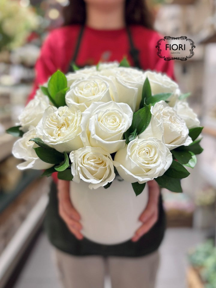 White on White. 24 premium white roses in our exclusive white containers beautifully complemented with luxe seasonal greens.