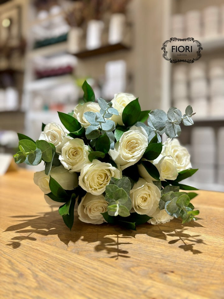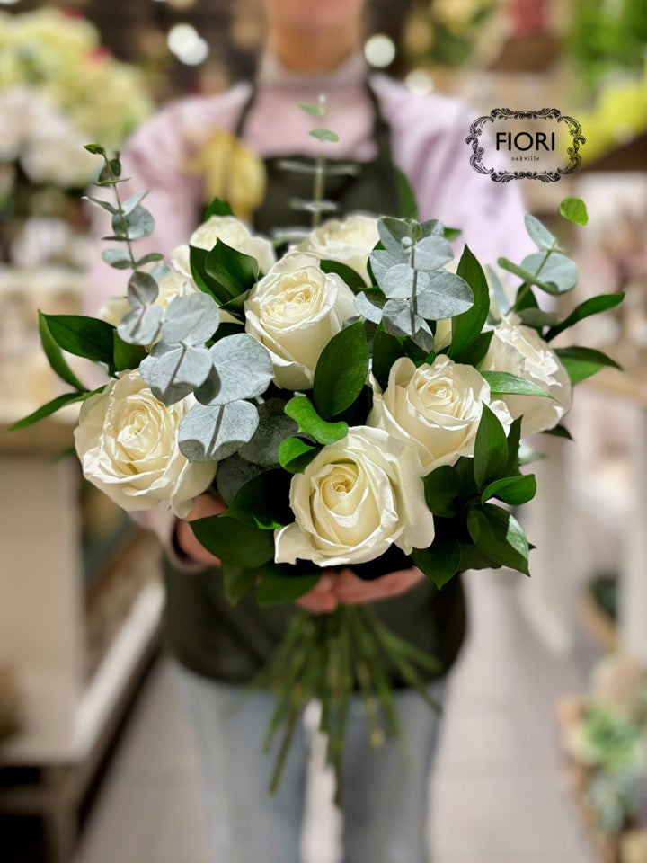 A dozen of the finest most beautiful Long Stem WHITE ROSES and premium greens send a message of PURE LOVE. This flower bouquet is delivered in our signature wrapping.